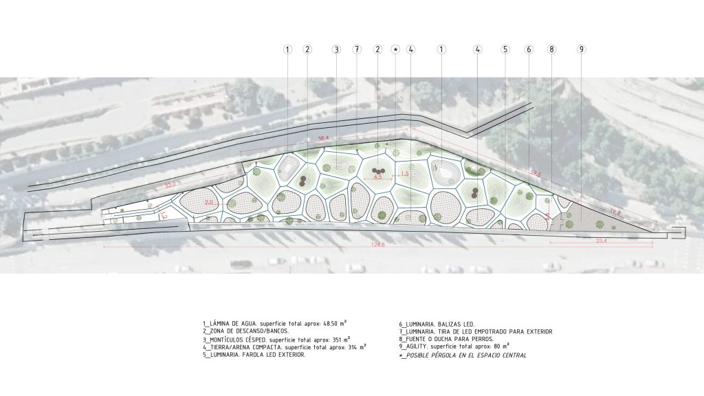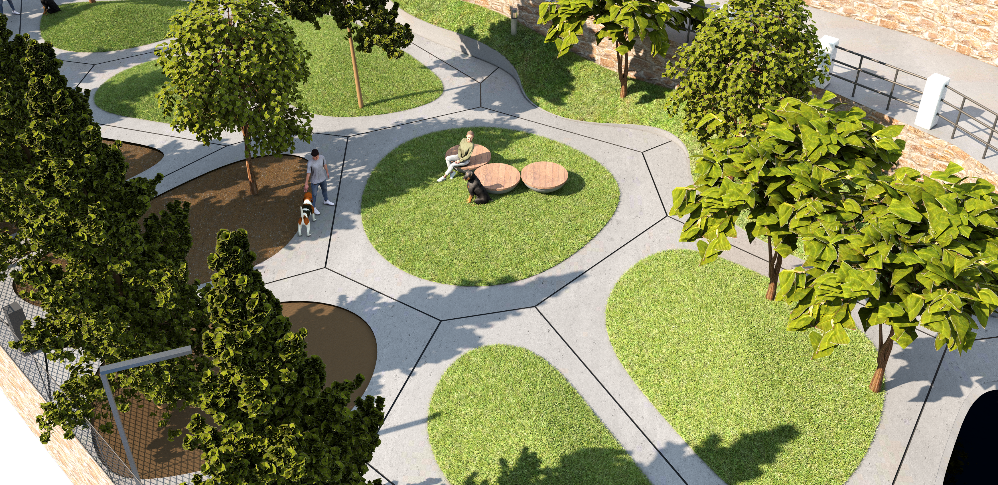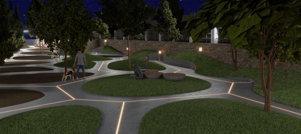 Desde el estudio se proyecta un recorrido iluminado por toda la superficie de la parcela, dando lugar a varios caminos alternativos para que los usuarios paseen y acompañen a sus mascotas, promoviendo el desahogo, la expansión, incentivando el movimiento y creando así armonía entre los usuarios.