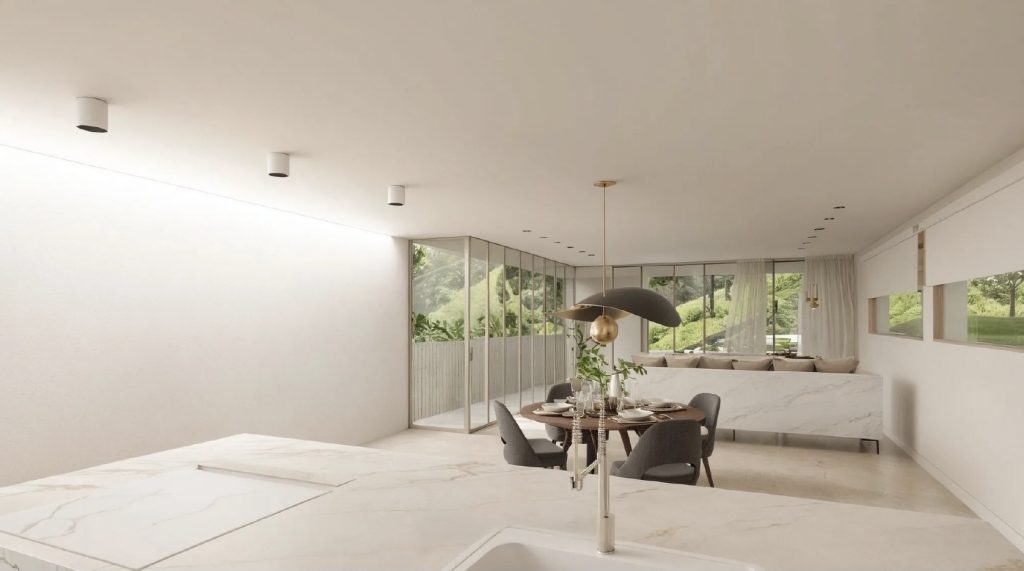 La cocina, situada estratégicamente en el centro, organiza el espacio y articula las zonas de uso diario, generando fluidez y funcionalidad sin perder la conexión visual con el entorno.