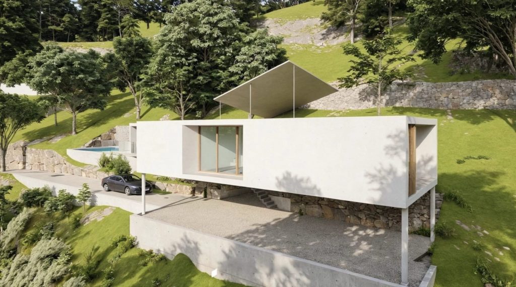 Ubicada en una ladera de fuerte pendiente, esta vivienda unifamiliar se adapta al terreno de forma orgánica, evitando intervenciones agresivas.